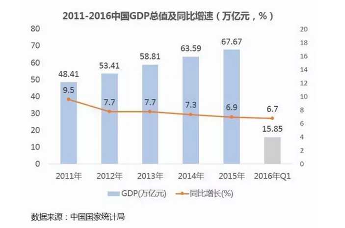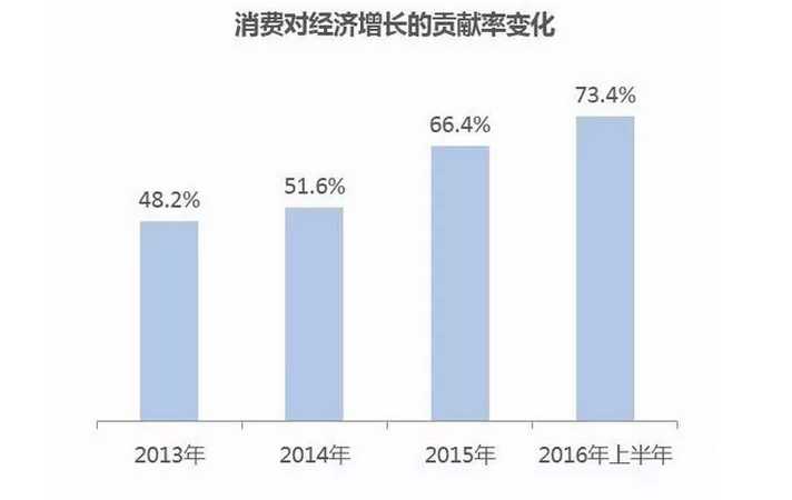 從 宏觀大環境來看,2016 年國民經濟延續 2015 年的zhongg速增長,GDP 增速難以逾越 7% 大關。與此同時,消費占經濟增長的比率逐年提升,2016 年上半年達到 73.4%,成為經濟增長的重要引擎。在經濟進入zhongg速增長的新常態下,供給側改革創新與居民消費升幾的趨勢顯現。